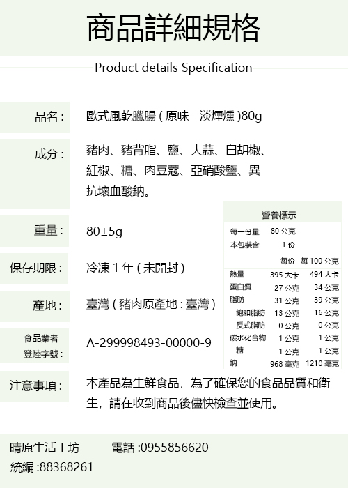 晴原臘腸 ( 選用最新鮮臺灣溫體豬 . 美國橡木 . 西班牙紅椒粉 . 採用傳統的熟成工藝 . 讓臘腸在漫長的180天中脫掉水分 . 留下最精華的滋味。 )