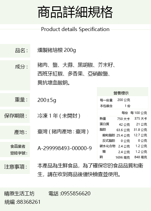 晴原豬培根 ( 選用最新鮮臺灣溫體豬 . 美國橡木 . 西班牙紅椒粉 . 用傳統的熟成及柴燒工藝 . 讓培根在煙幕中12小時 . 讓肉香與柴火香完美結合。 )