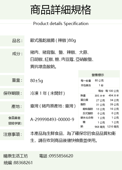 晴原臘腸 ( 選用最新鮮臺灣溫體豬 . 辣椒碎粒 . 西班牙紅椒粉 . 採用傳統的熟成工藝 . 讓臘腸在漫長的180天中脫掉水分 . 留下最精華的滋味。 )